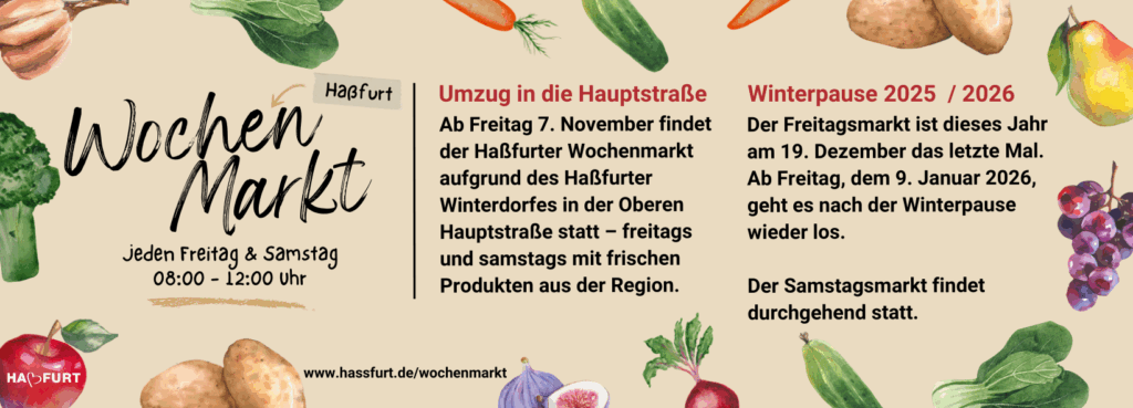 Der Wochenmarkt findet aufgrund des Haßfurter Winterdorfes in der Oberen Hauptstraße statt.